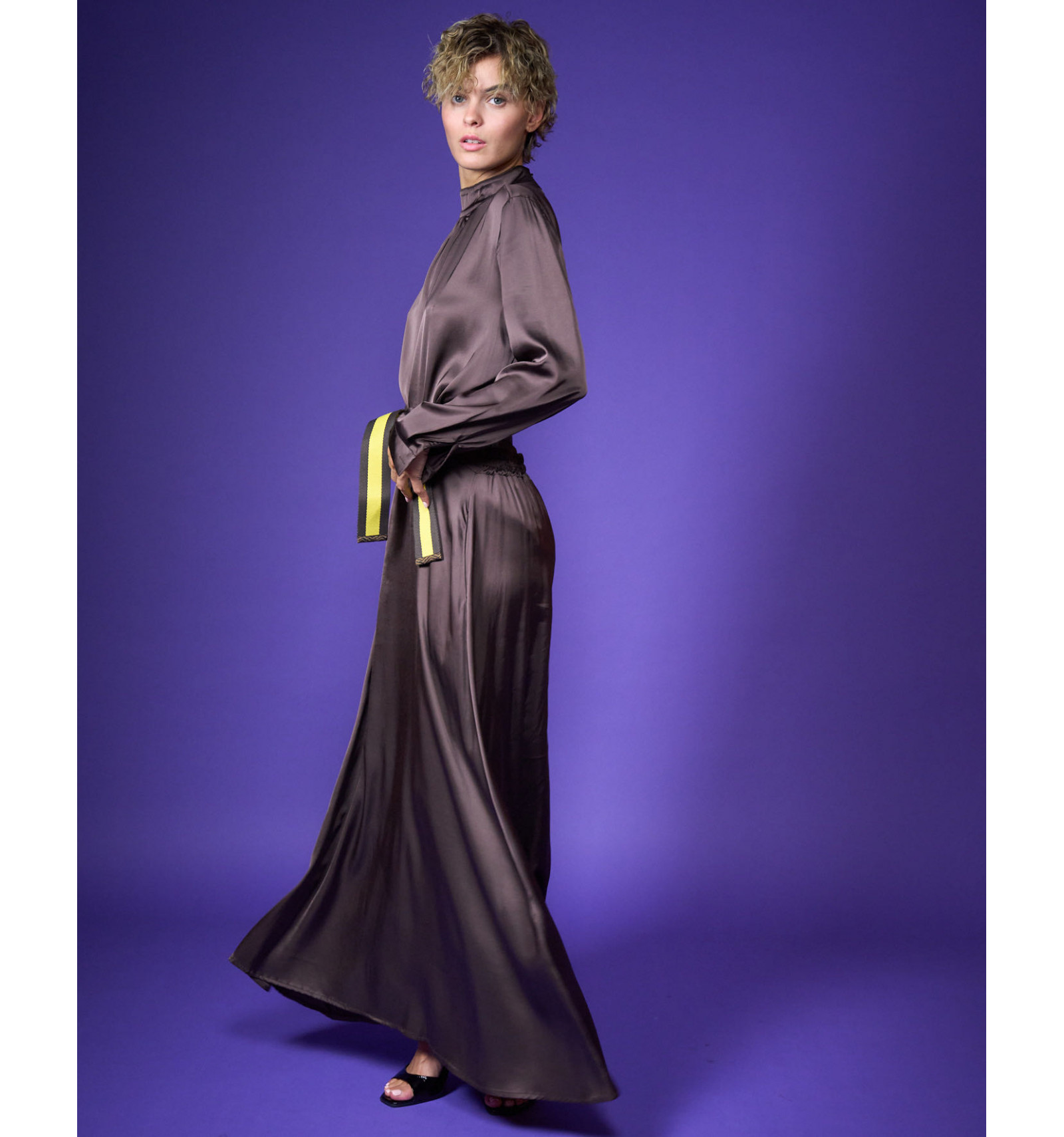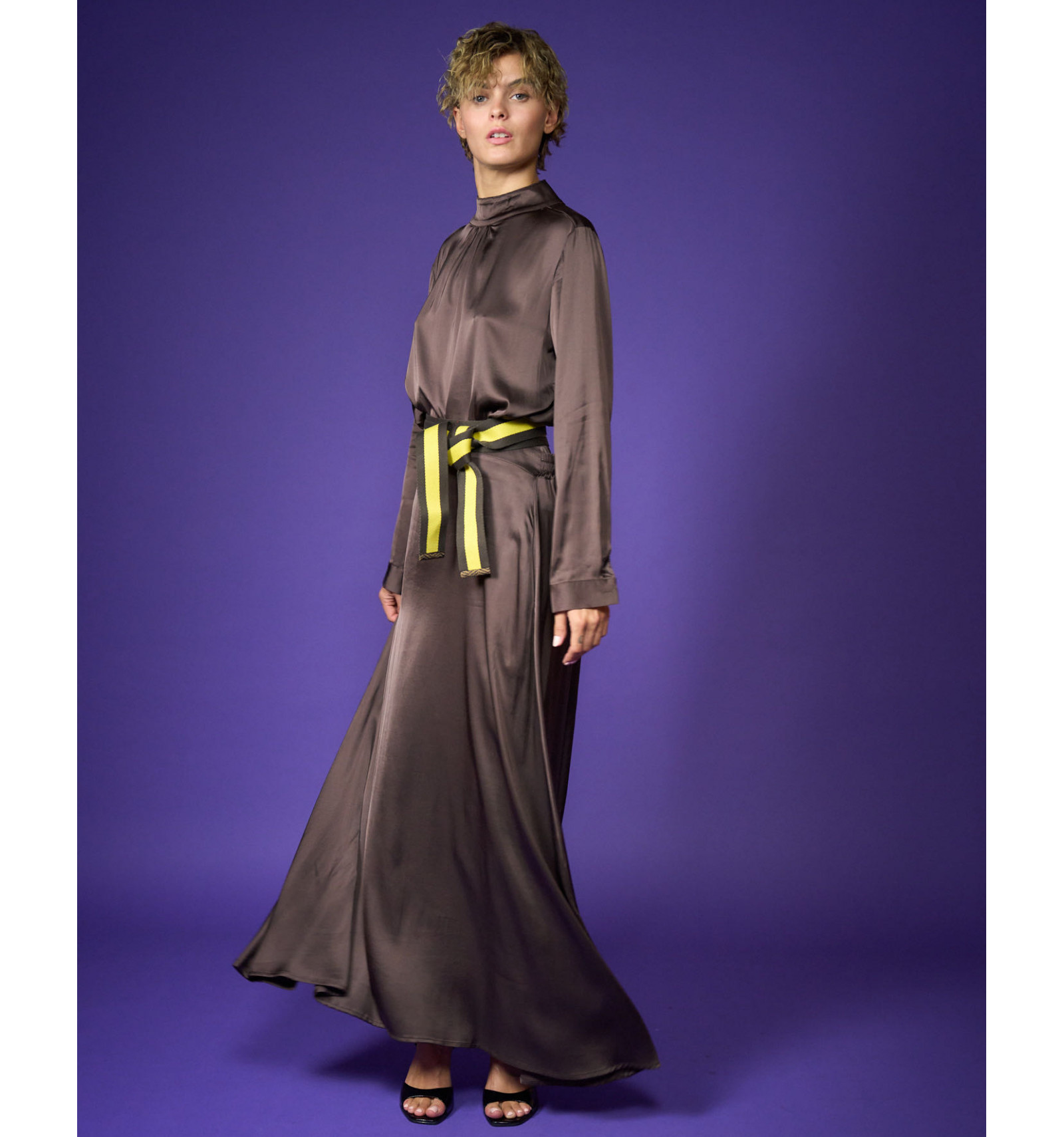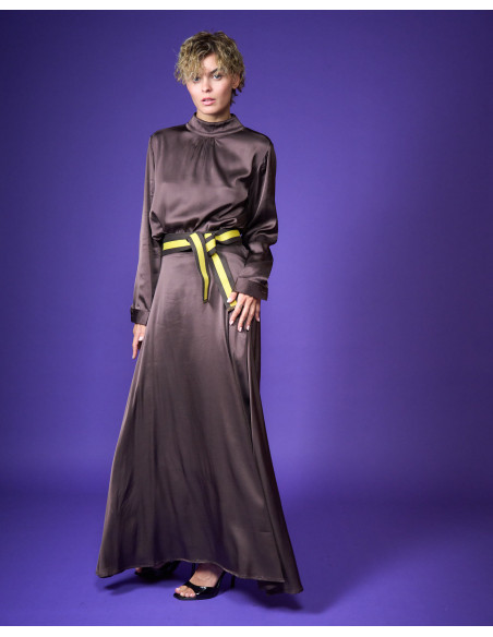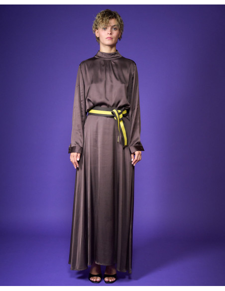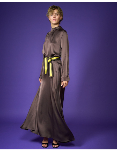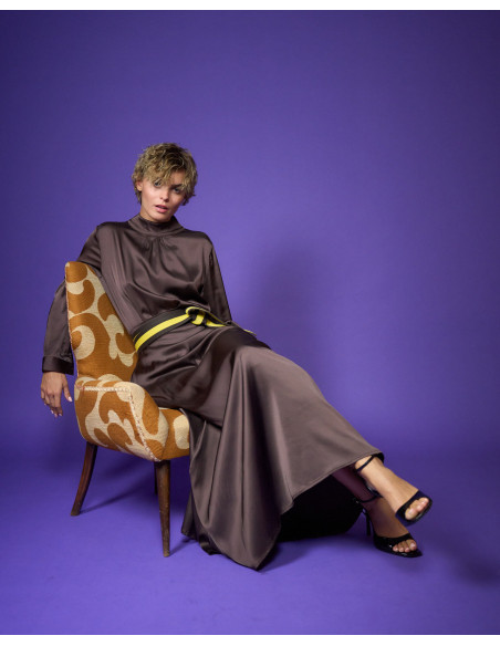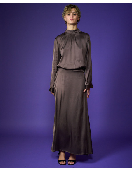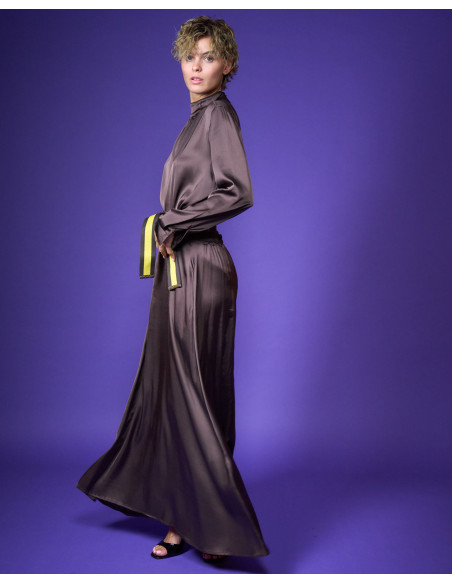 Camicia in raso di viscosa stretch collo a lupetto bottoni sul collo dietro