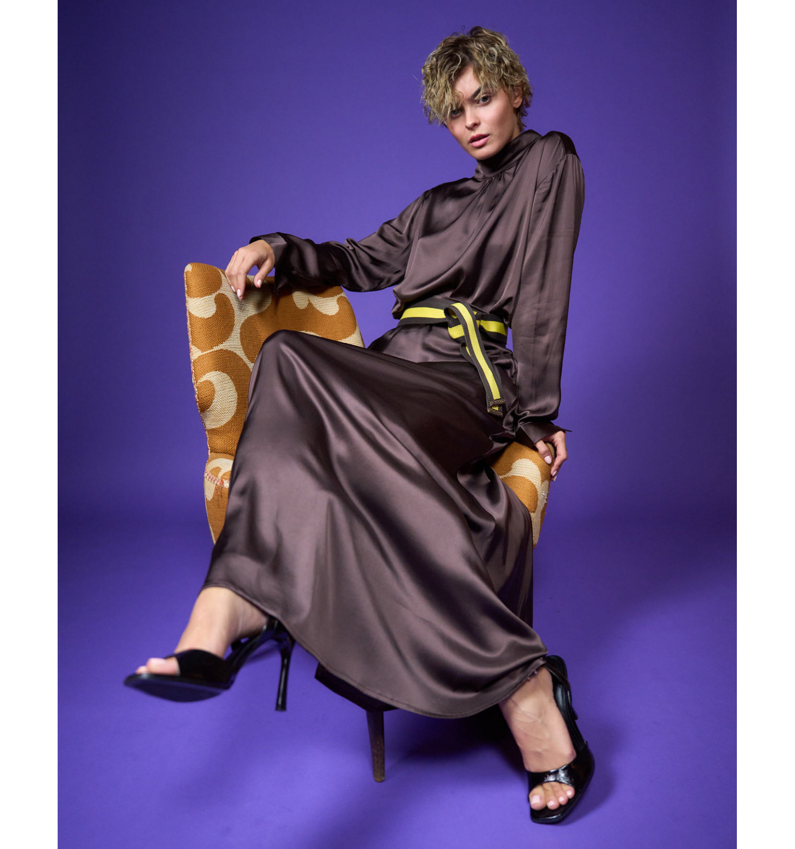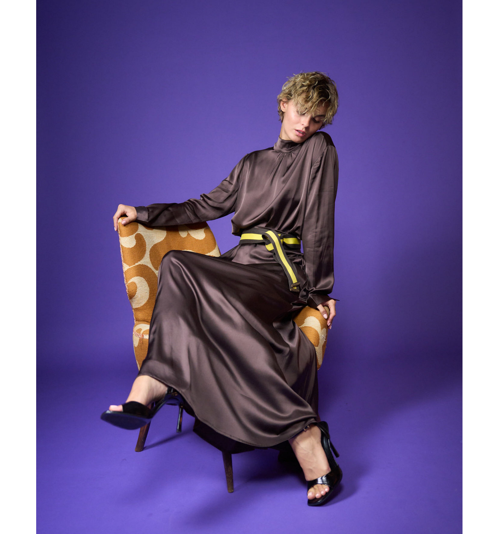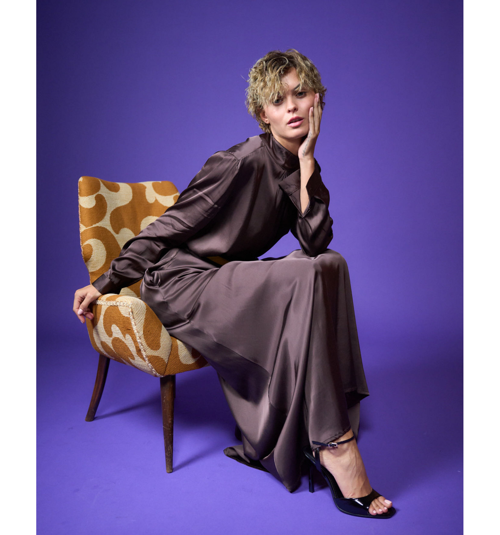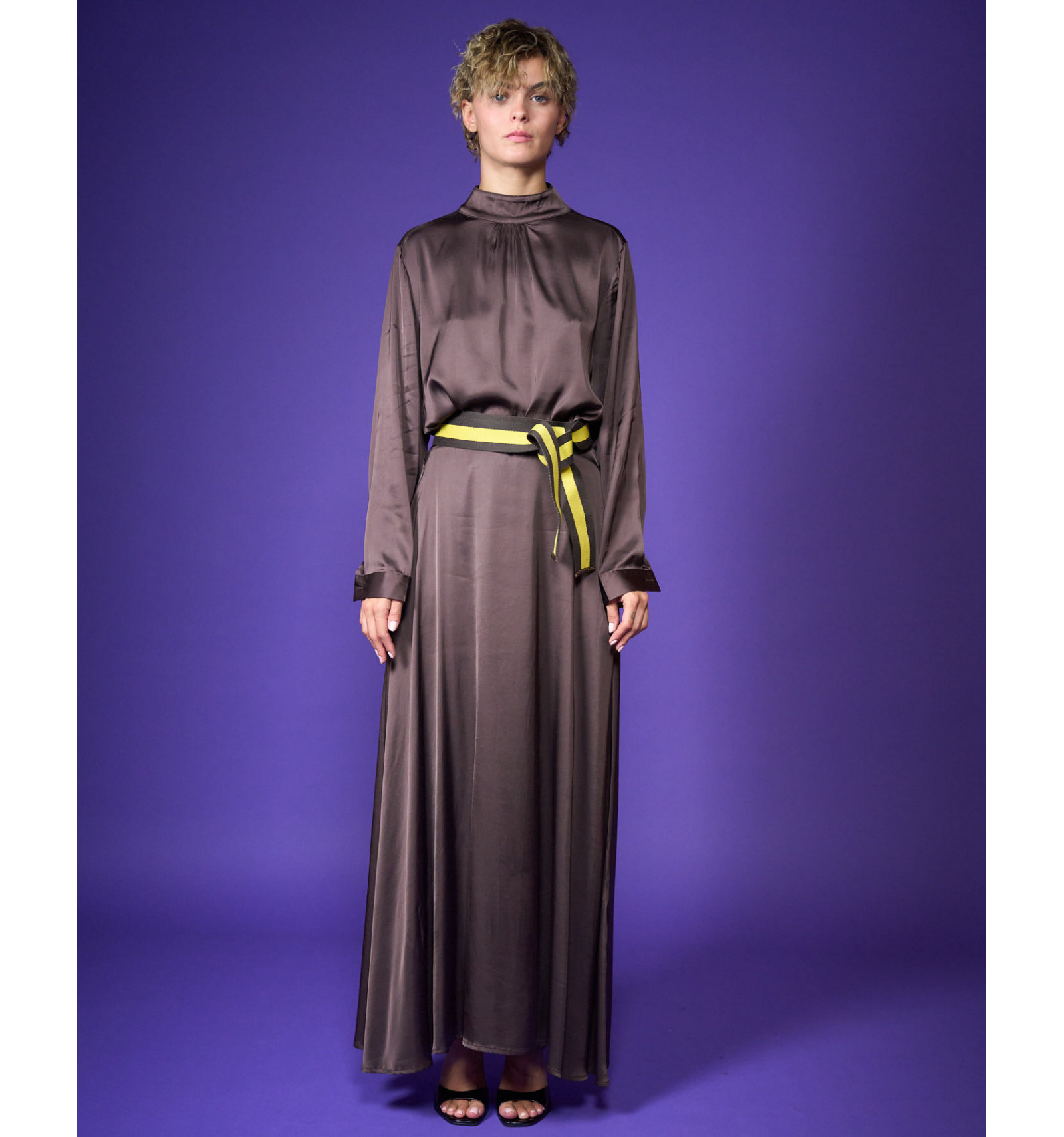 Camicia in raso di viscosa stretch collo a lupetto bottoni sul collo dietro